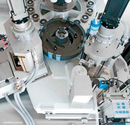 Сервомотор в узле этикетирования точно контролирует натяжение пленки, которая разматывается, режется и передается на бутылку с помощью вакуумной системы. Клеевой ролик из нержавеющей стали распределяет клей на кончики этикеток. Конструкция ролика гарантирует минимальный расход клея.