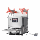 соединение в одной модели функций газонаполнения, запайки и обрезки пленки. При запайке аппарат сам обрезает пленку по контуру лотка, без участия оператора. После установки стакана в матрицу она перемещает стакан в зону запайки и обрезки, после чего уже запечатанный стакан возвращается в исходную позицию;