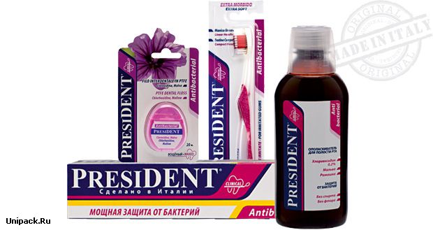 Средства для мощной защиты от бактерий PresiDENT: зубная паста, ополаскиватель, зубная щетка, фитофлосс и пр.