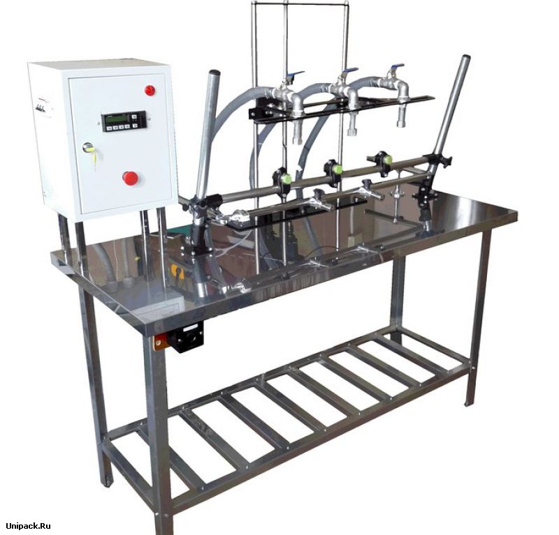 Дозатор выполнен в виде нержавеющего стола. На столе смонтирован блок управления, насос, датчики уровня и разливочные патрубки с отсечными клапанами. Дозатор является универсальной установкой, позволяющей наполнять любую тару густыми и жидкими продуктами. В зависимости от продукта дозатор может комплектоваться различными типами подающих насосов и клапанов. Для увеличения производительности мы можем изготовить дозатор под заказ с тремя или четырьмя разливочными патрубками.