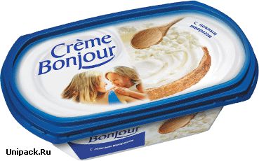 Мягкий крем-сыр CremeBonjour с нежным творогом в пищевом контейнере.